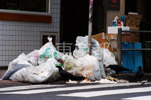 タイトル: ごみをあさるカラス