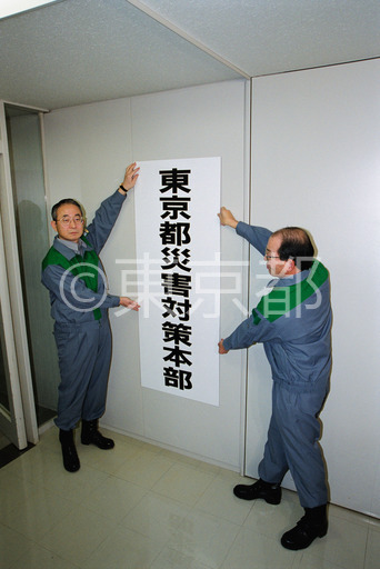 タイトル: 2000年問題災害対策本部の看板掛け