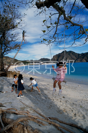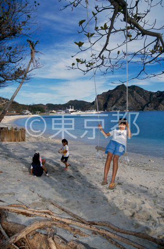 タイトル: 大村の浜でブランコに乗る少女