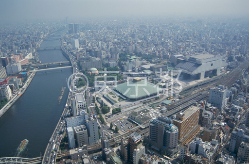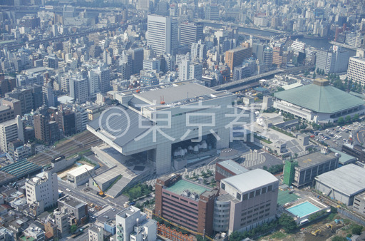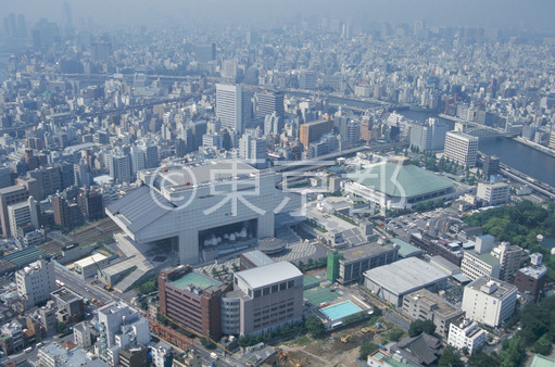 タイトル: 両国国技館と江戸東京博物館(空撮)