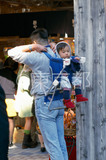 タイトル: 子どもを背負った若い父親
